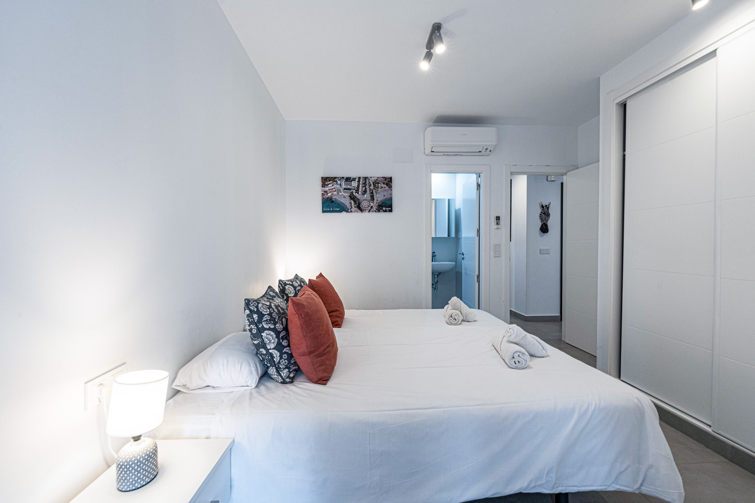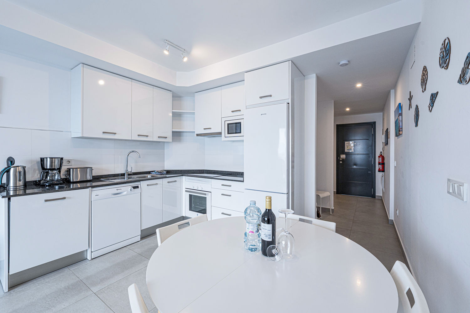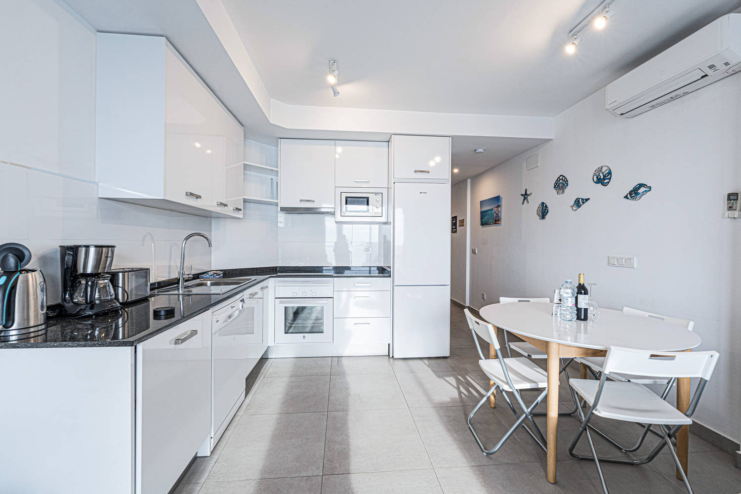 The flat has two bedrooms and two bathrooms: one with a king size bed and private bathroom, and another bedroom with bunk beds. It also has a fully equipped modern kitchen with state-of-the-art appliances, perfect to make you feel at home during your holiday.