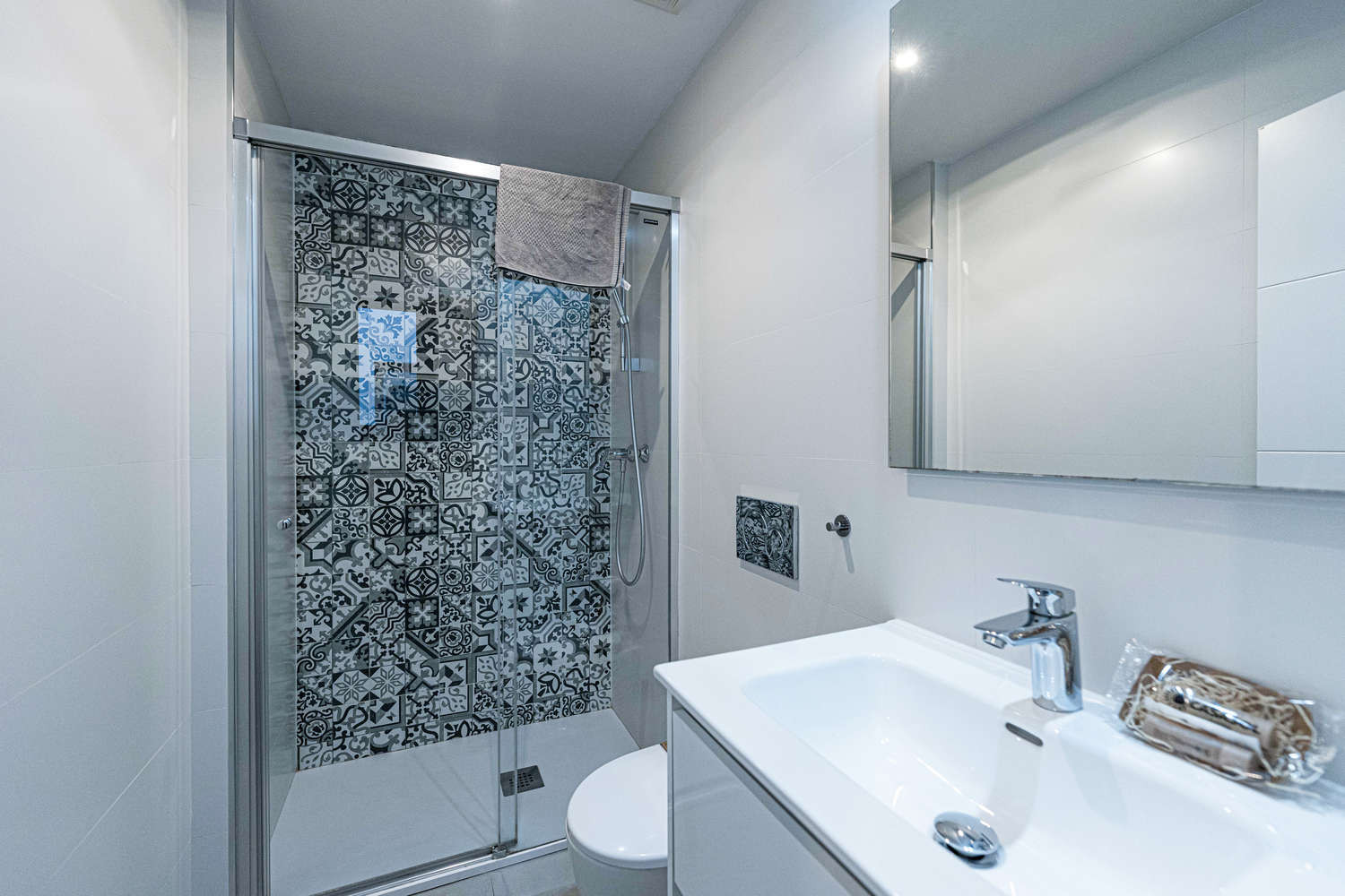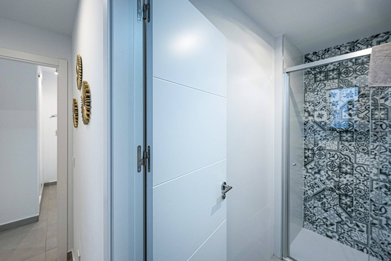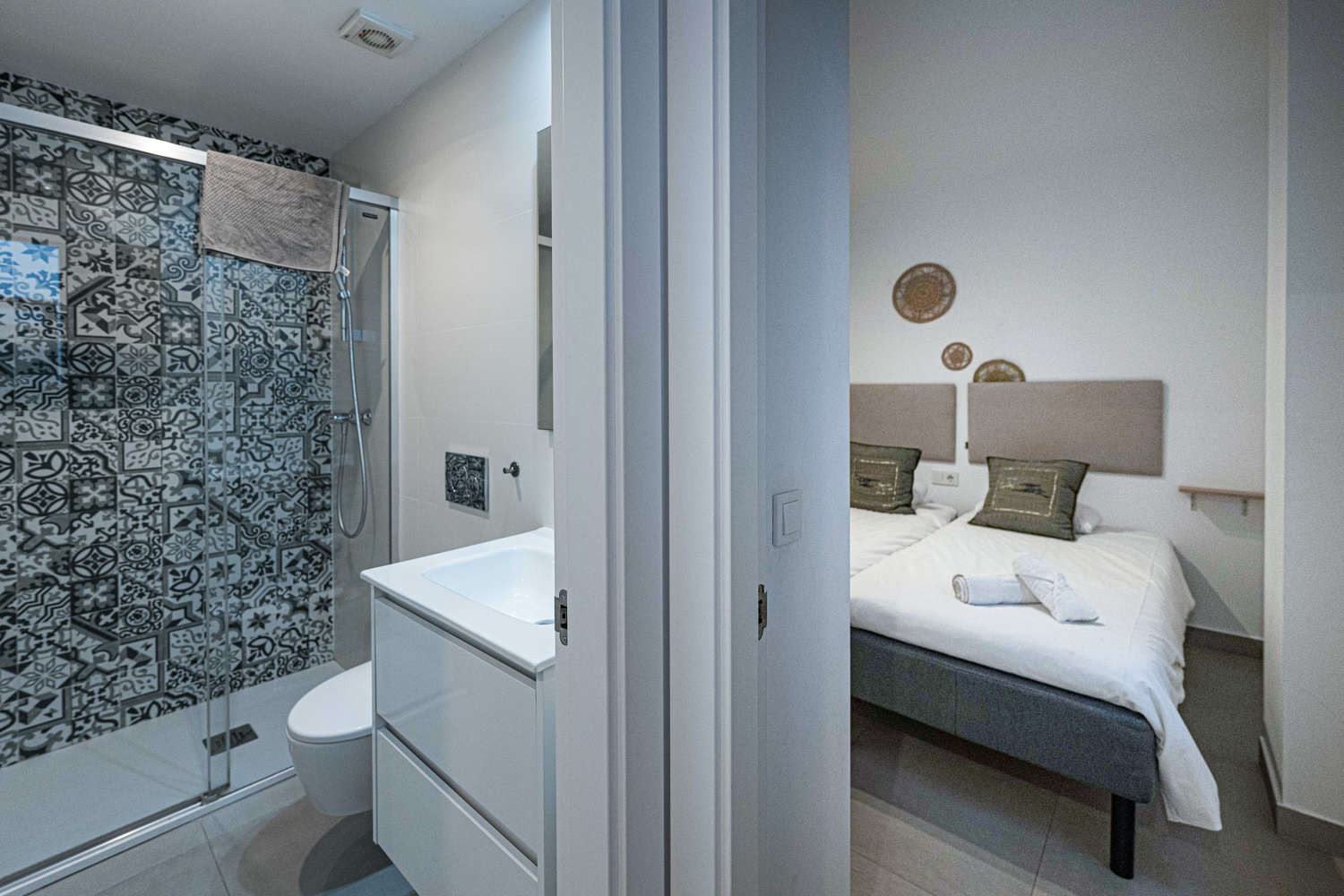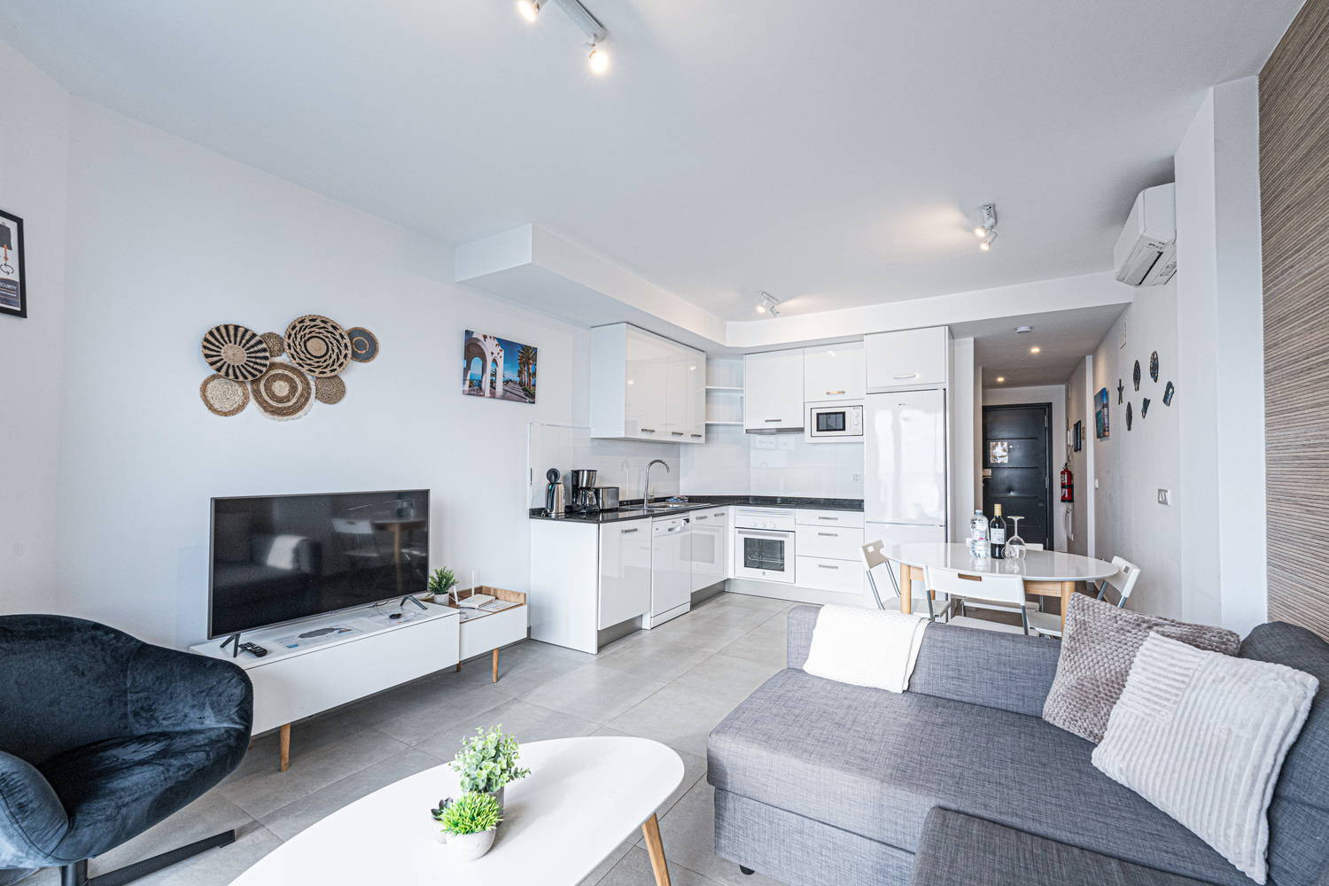 The flat has two bedrooms and two bathrooms: one with a king size bed and private bathroom, and another bedroom with bunk beds. It also has a fully equipped modern kitchen with state-of-the-art appliances, perfect to make you feel at home during your holiday.