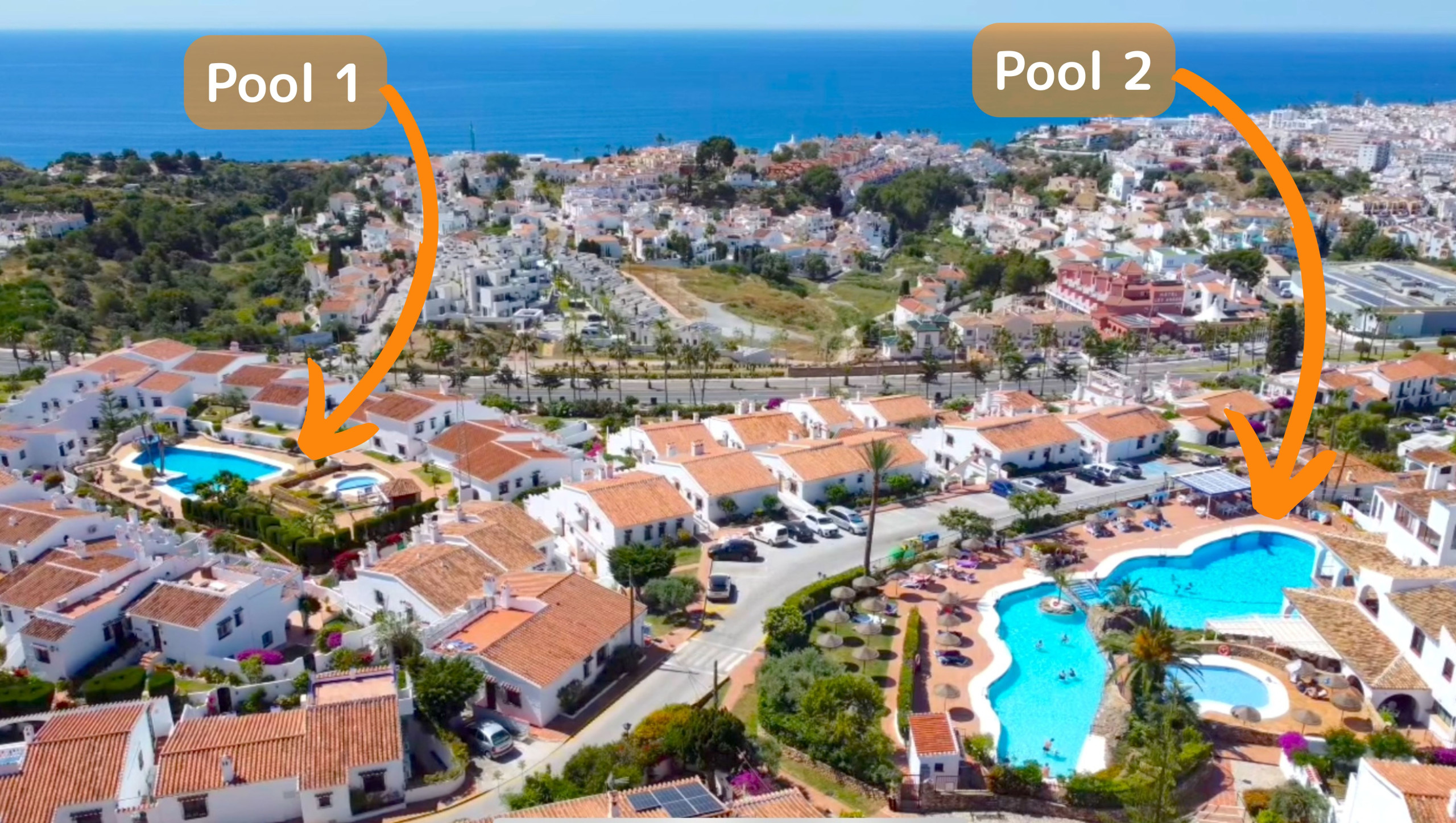 - Två stora gemensamma pooler i närheten (en är öppen året runt)