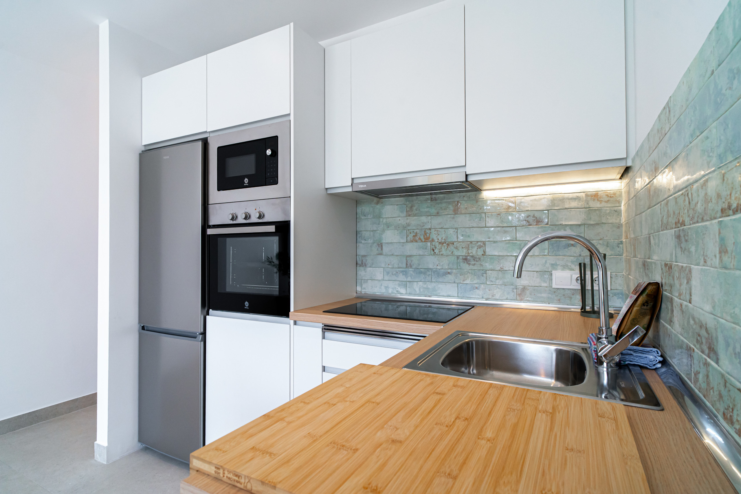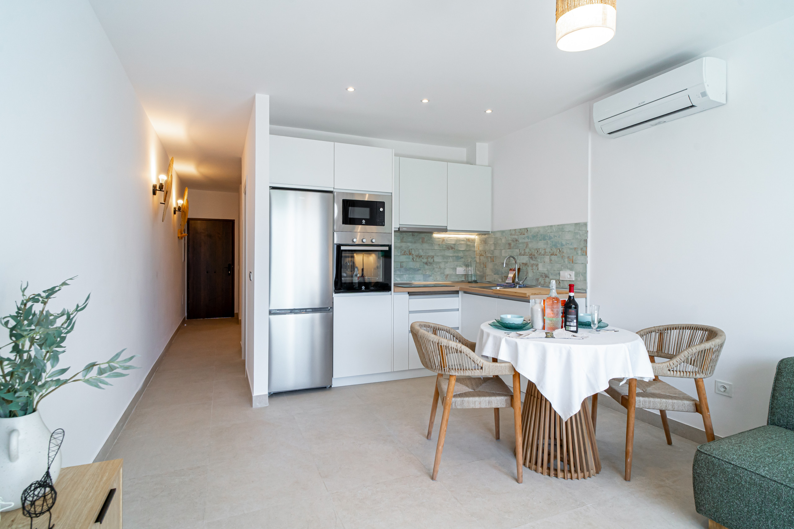 Lägenheten har ett modernt badrum med en elegant dusch, som erbjuder en uppfriskande plats att börja eller avsluta dagen på. Köket är fullt utrustat med toppmoderna vitvaror, perfekt för att laga allt från snabba frukostar till gourmetmiddagar.
