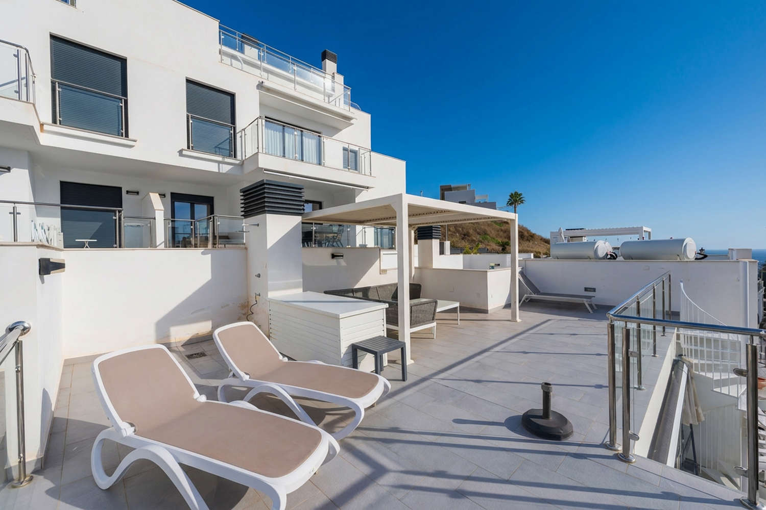 Mycket modern takvÄning med spektakulÀr havsutsikt och en stor terrass med lounge och utomhusdusch. Perfekt kommunicerad med de nÀrliggande stÀderna Torrox Costa och Nerja, i hjÀrtat av Malagas östra kust i det nya Balcón del Mar-komplexet.