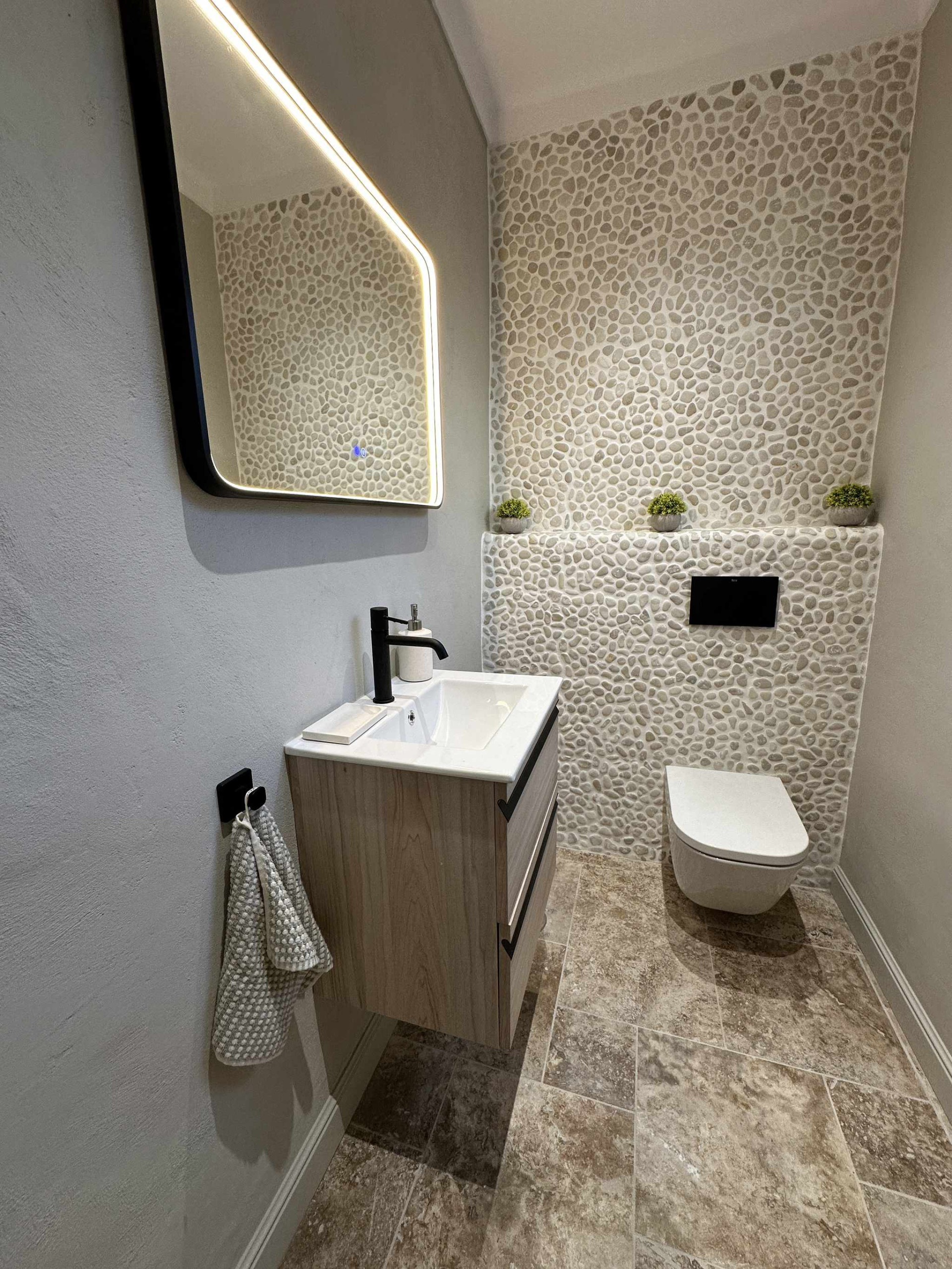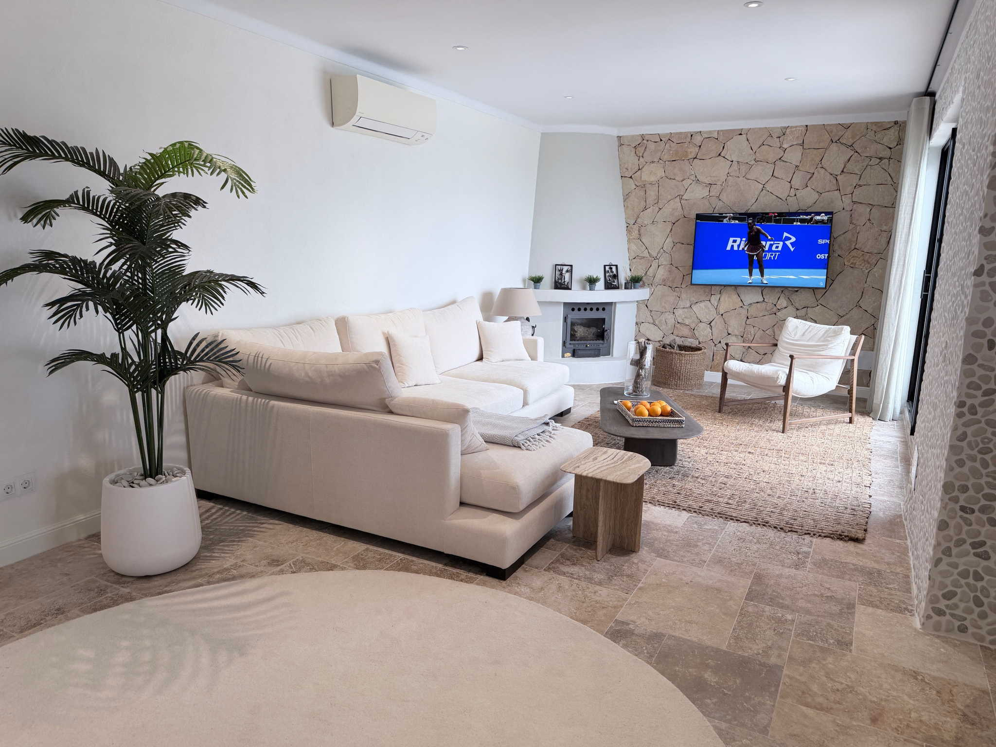 Husets planlösning är utformad för att rymma fyra personer bekvämt. Vid ingången finns en praktisk gästtoalett som betjänar de gemensamma utrymmena. Till vänster ligger det första sovrummet, utrustat med en dubbelsäng av hög kvalitet och ett eget badrum. Vardagsrummet, inrett i en modern och mysig stil, ansluter till ett halvöppet, fullt utrustat kök. På andra sidan rummet finns det andra sovrummet, som också har ett eget badrum och en dubbelsäng. Denna ”dubbla svit”-konfiguration garanterar att varje par eller gäst har sitt eget privata utrymme utan att behöva dela badrum.